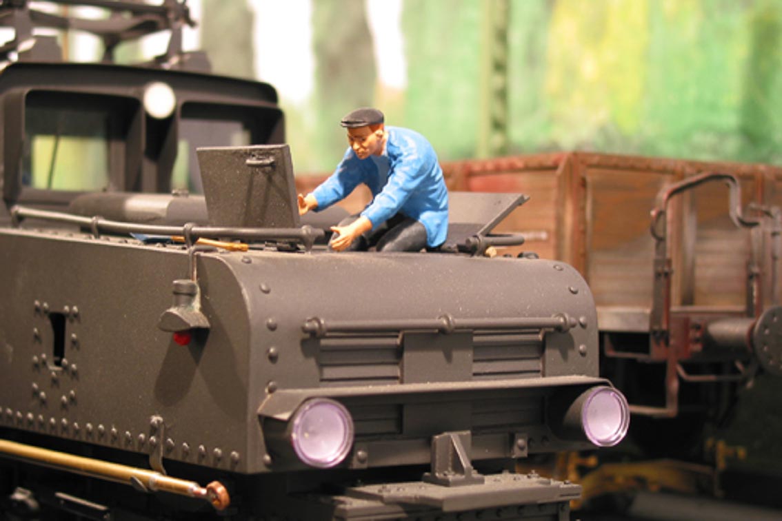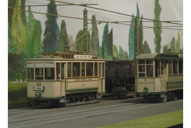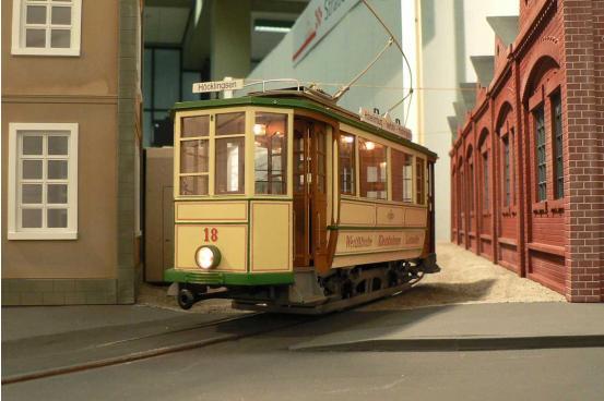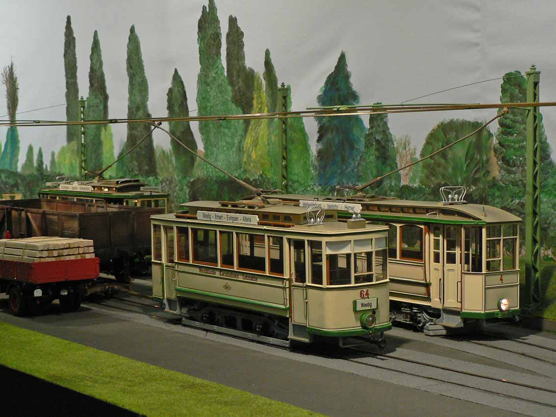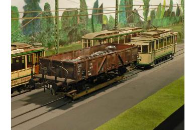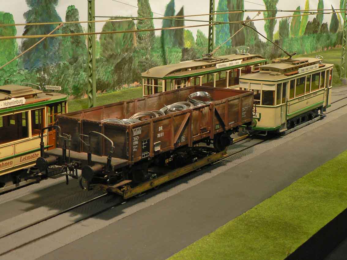 Als Gleismaterial wurde das Stahlschinengleis von Revalda. verwendet. Zur Nachbildung der Rillenschienen wurden L-Profile (4 mm x 4 mm) seitlich der Schienenprofile verlegt. Die Weichen werden durch Unterflurantriebe gesteuert. Die Steuerung der Anlage erfolgt konventionell analog mittels Z-Schaltung, d.h. der gesamte Gleisplan ist in Abschnitte eingeteilt, die mittels einfacher (Kipp-) Schalter zu- geschaltet werden können. Damit die Beleuchtung der Fahrzeuge unabhängig von ihrer Geschwindigkeit konstant leuchtet, wurde ein zweiter Stromkreis installiert - für den Fahrbetrieb bilden die beiden Schienen die Pole, für die Beleuchtung die Oberleitung und ein Schienenprofil. Dies bedingt den Einsatz von zwei galvanisch getrennten Stromquellen, d.h. es müssen zwei separate Transformatoren mit jeweiligem Regler benutzt werden.