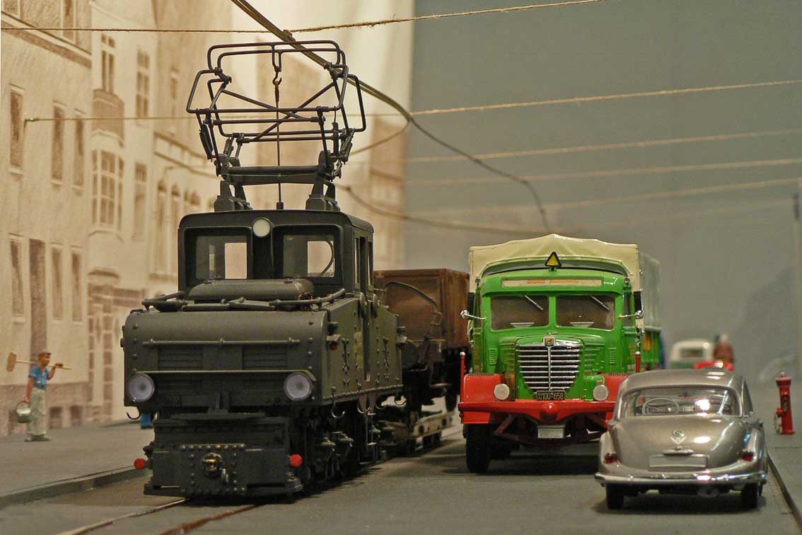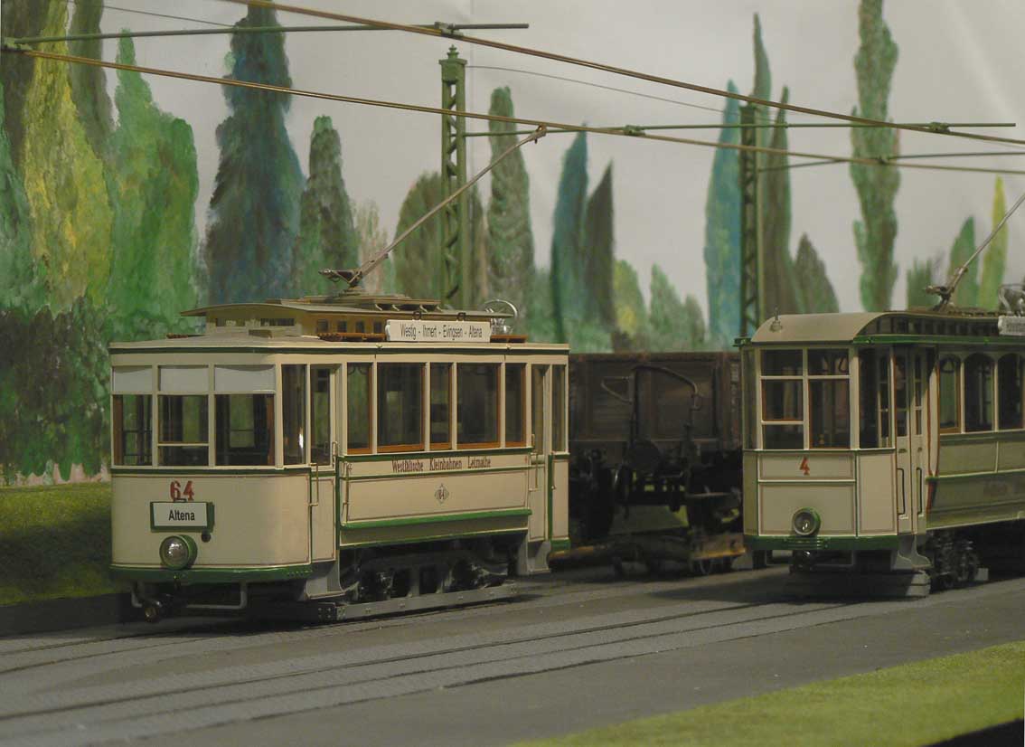 Die Oberleitung ist demzufolge funktionstüchtig. Im Bereich der Ausweiche Hemer Amt wurde eine an den Häusern befestigte Oberleitung nachgebaut. An den Gebäuden beim Vorbild befanden sich so genannte Rosetten, an denen die quer über die Straße gespannten Halteseile für die Oberleitung befestigt waren. Im Modell wird die Oberleitung auf der nördlichen Straßenseite von in der Rückwandkulisse eingelassenen Haken gehalten. Auf der gegenüberliegenden Betrachterseite dienen, da hier keine Gebäude nachgebildet werden konnten, einfache Masten als Gegenstück. Auf dem Teilstück Ihmerter Tal wurde eine Oberleitung mit seitlich neben der Fahrbahn stehenden Masten nachgebaut. Die Gittermasten stammen von LGB, welche einen neuen Ausleger aus Messingrohr erhalten haben.